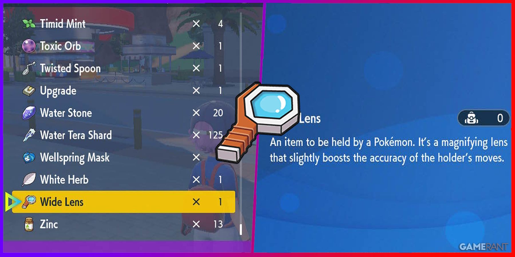 Items dropped during battles can be extremely useful to your Pokemon, so you should make a habit of giving them to your party as soon as possible. A hold item you might consider for your Pokemon Scarlet and purple A wide lens. This will boost your Pokemon's accuracy, which makes it useful if your Pokemon moves with low accuracy like Fire Blast. There is only one shop Scarlet and purple Who sells wide lenses.