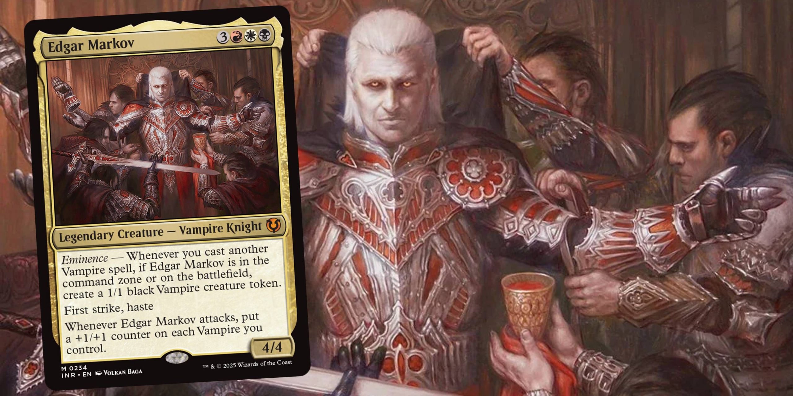 For the most part, vampires are either red, white, or black, allowing Edgar Markov to play all the best vampire and vampire support cards. Eminence is one of the most powerful mechanics in all of Magic, and Edgar Markov has one of the best known effects, so you can play vampire cards in the bulk bin and still have a great deck.