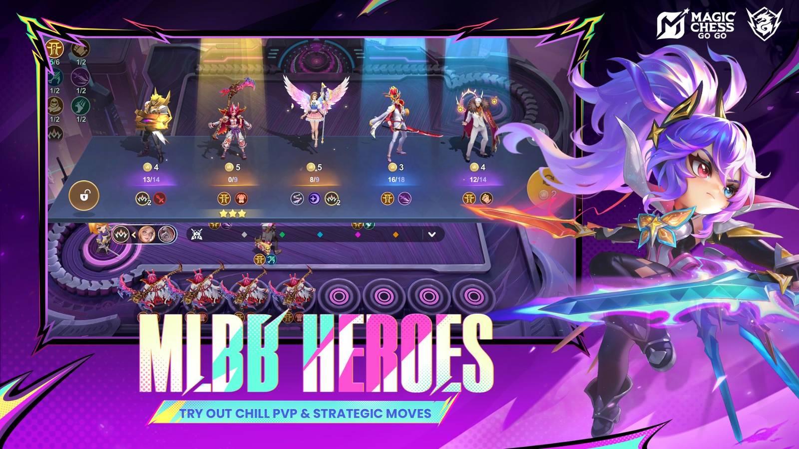 Magic Chess: Go is a super exciting strategy game where you build teams of great heroes and commanders to fight in the best auto-chase games. Set in a bright neon city, you choose heroes from fun factions like Exorcist, Heartbond, Neobeasts, and Mystic Meow.